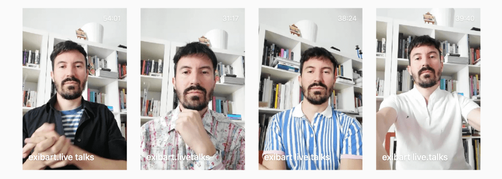 Infine, la programmazione messa a punto da exibart, intitolata “exibart.livetalks” cha va in onda sempre via Instagram live tre volte alla settimana, con una serie di interviste condotte dal direttore Matteo Bergamini; motto: “Interviste face to face con i protagonisti e le protagoniste del mondo dell’arte e della cultura”.